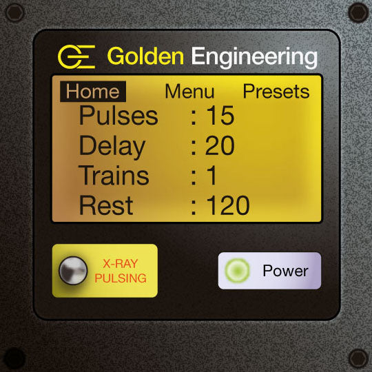 Pulses can be set for up to 999 pulses, with variable pulse rate (1 pulse per second or slower). Operators can also set pulse trains, allowing for detailed control over the number of pulses fired and the length of time between pulses.